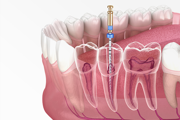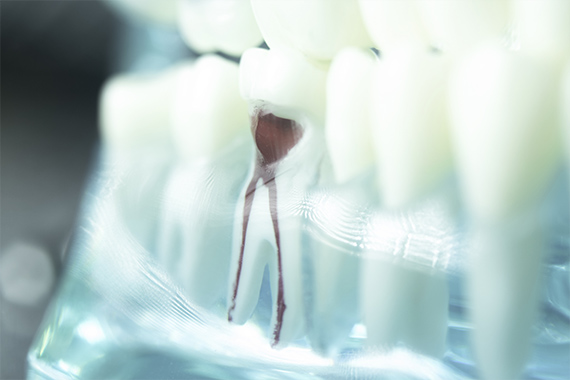 歯の根の内部には、根管と呼ばれる細い部分があります。この根管にまでむし歯が進行した場合、歯を守るために行うのが根管治療です。むし歯菌に侵された根管内の組織を取り除き、洗浄・消毒の後、再感染しないように密閉します。根管内はとても狭く、複雑な形状で、治療を担当する歯科医師に確かな技術と経験が求められる治療でもあります。