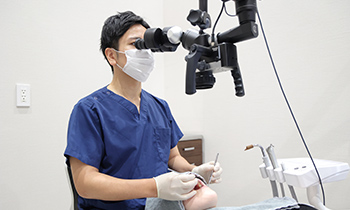 患部を20倍にも拡大して確認できる歯科用の顕微鏡です。暗く細い根管内を照明で明るく照らすこともでき、より精密な処置、病変の取り残し予防に役立ちます。根管内の状態や治療の様子を、鮮明な画像として記録する機能も備えています。