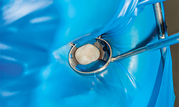 ラバーダムは治療する部分以外を覆うゴム製のシートです。治療時にこのシートを装着することで、唾液に含まれる細菌の根管内への侵入をシャットアウトでき、治療の成功率向上につながります。小さな器材や薬剤が、患者さんのお口の中に落ちる心配もありません。