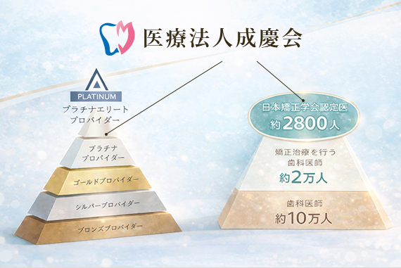 マウスピース矯正ブランドであるインビザライン社から、症例の多い医院に与えられるプラチナムエリートを受賞しています。また矯正だけではなく、ホワイトニングやセラミック治療などを包括的に組み合わせた審美治療を得意にしています。症例数が多く、多様な症例に対応でき、日本矯正歯科学会認定医も在籍しています。1つの患者さんの治療計画を複数の歯科医師が監修いたしますので、より精度の高いマウスピース矯正が可能です。